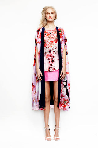 SILK LONG KIMONO STYLE JACKET FEATURING OUR SIGNATURE DIGITAL PRINTED NAVY BLOSSOM FABRIC
