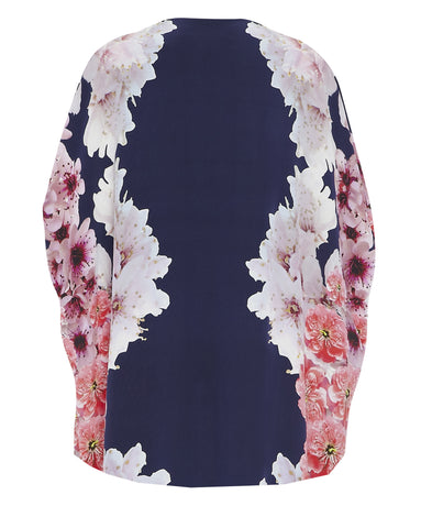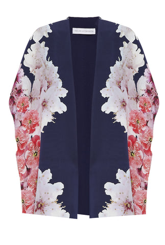 SILK SHORT KIMONO STYLE JACKET FEATURING OUR SIGNATURE DIGITAL PRINTED NAVY BLOSSOM FABRIC