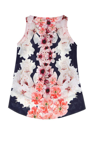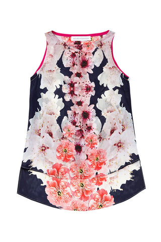 100% SILK TANK TOP WITH LOWER BACK HEMLINE FEATURING OUR SIGNATURE NAVY BLOSSOM DIGITALLY PRINTED FABRIC