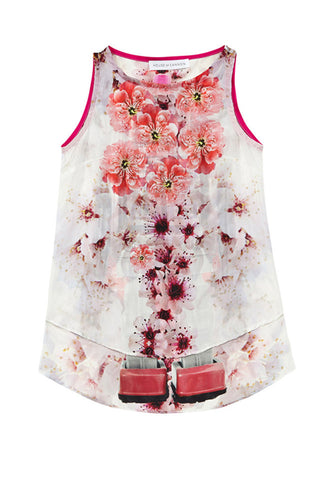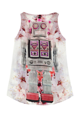 100% SILK TANK TOP WITH LOWER BACK HEMLINE FEATURING OUR SIGNATURE MEGA ROBOT SILVER DIGITALLY PRINTED FABRIC.