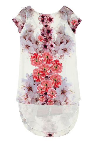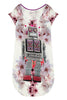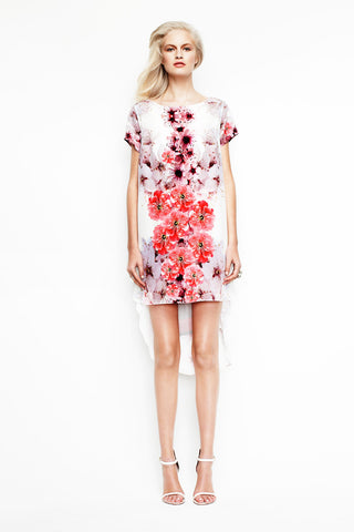 SILK T-SHIRT DRESS FEATURING A CLASSIC BOAT NECK AND DROP BACK HEM LINE WITH OUR