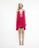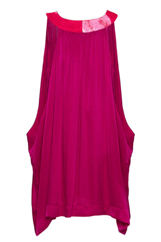SILK TUNIC STYLE DRESS FEATURING LOW CUT NECK LINE AS WELL AS OUR SIGNATURE DIGITALLY PRINTED MEGA ROBOT SILVER TRIM AND FUSHIA CREPE DE CHINE OUTER.