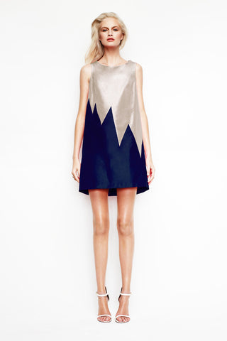 SILK TAFFETA SHIFT DRESS FEATURING TWO TONE NAVY AND GILVER FABRIC
